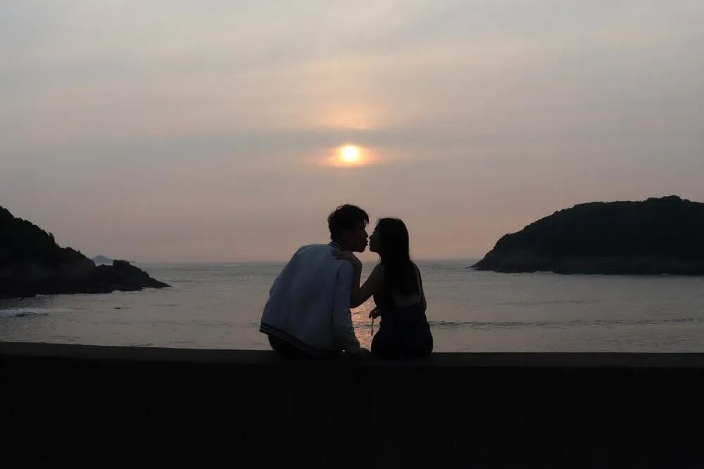 然后就是曝光。这个场景你俩确实可以一剪影呈现。但是当特写一点的时候,还是要有一些细节比较好。而特写因为你俩在画面占比大了,也自然容易曝光不那么黑。有一些人物的细节。同时拍摄时,可以再等等,太阳跑到云后面也没问题。再等等画面中天空的色彩应该会更好看,至少后期得更好看也容易一些。