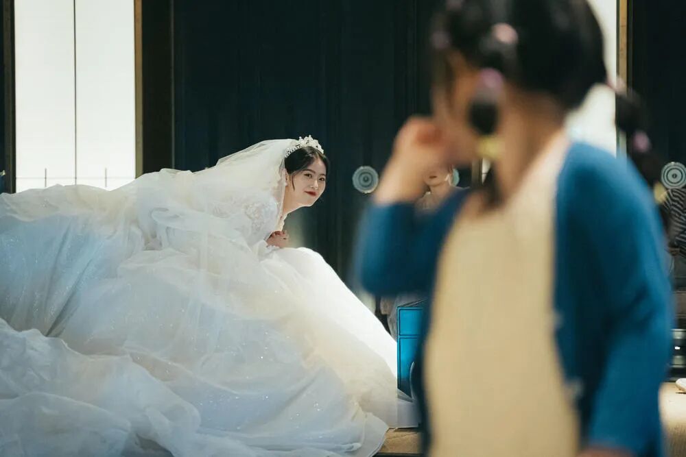 其次,取景还决定了画面中的元素以什么状态呈现。比如两个有互动的人——新娘和小女孩,在画面中大小的差异就太大了。近大远小相互呼应是没问题的。但是比例不需要差这么大。离远点,长焦一些就可以了。