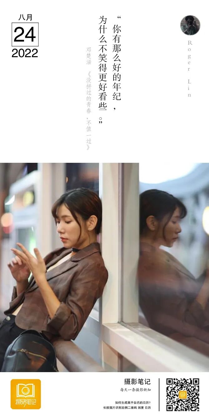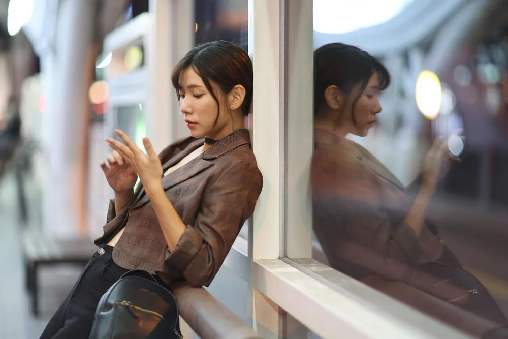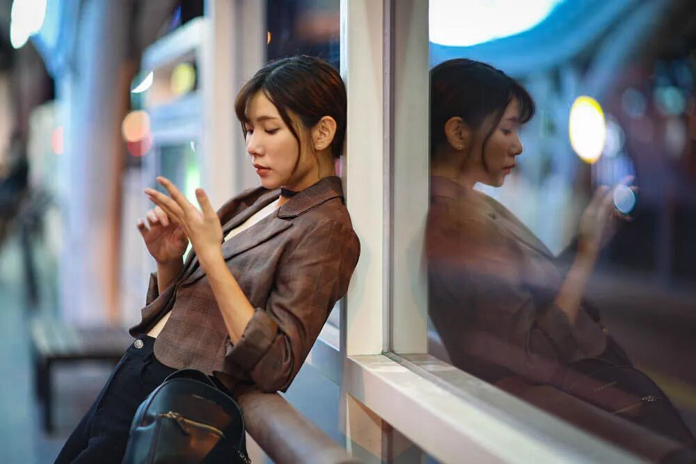 等公車的小姐姐,借玻璃的倒影抓拍一張。