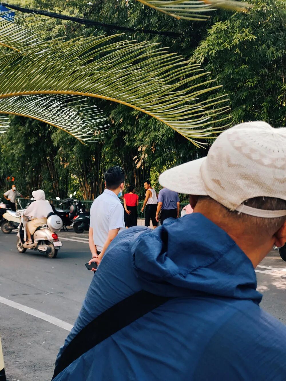 手机摄,昨晚走到这里,发现这位老人坐着轮椅在看跳舞,旁边陪同的且不说是啥关系,感觉有画面感,在他们后面找角度,拍了几张,拿出这张交作业,接受老师同学们的指教点评。