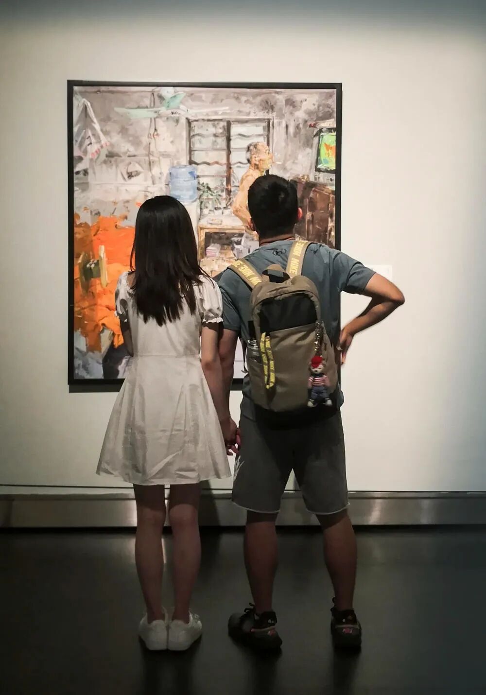或者看看什么角度,是不是强调下俩人牵着的手。这个找角度是考虑背景是什么,可以表达出俩人在看画。