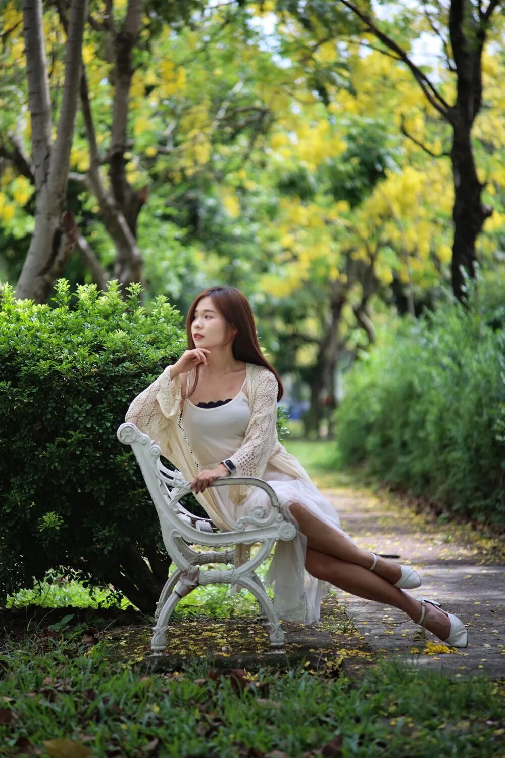 阿勃勒盛開的季節,約小姐姐在公園擺拍一張。