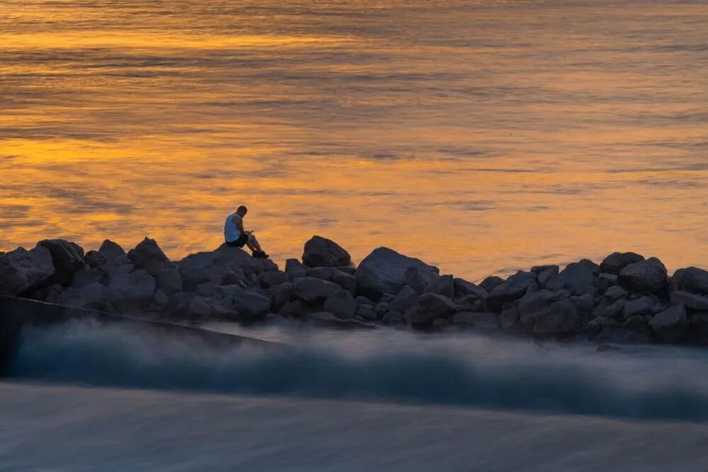 拍摄参数:尼康z5,f/32,3s,iso100,200mm夕阳打在江面上金灿灿得很好看,用慢门让排水渠的水看着像云雾。刚好一个人坐在那一动不动玩手机。其实旁边人声鼎沸,但这个画面里,我想表现一点孤独的美感。希望能表现一点点出来。。。