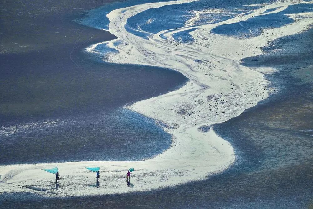 点评:非常漂亮的画面。这个角度拍摄过去,滩涂有一种延伸感,特别好。三个人可以说是非常棒的着眼点,人物状态也不错。取景方面,可以说做得很好了。