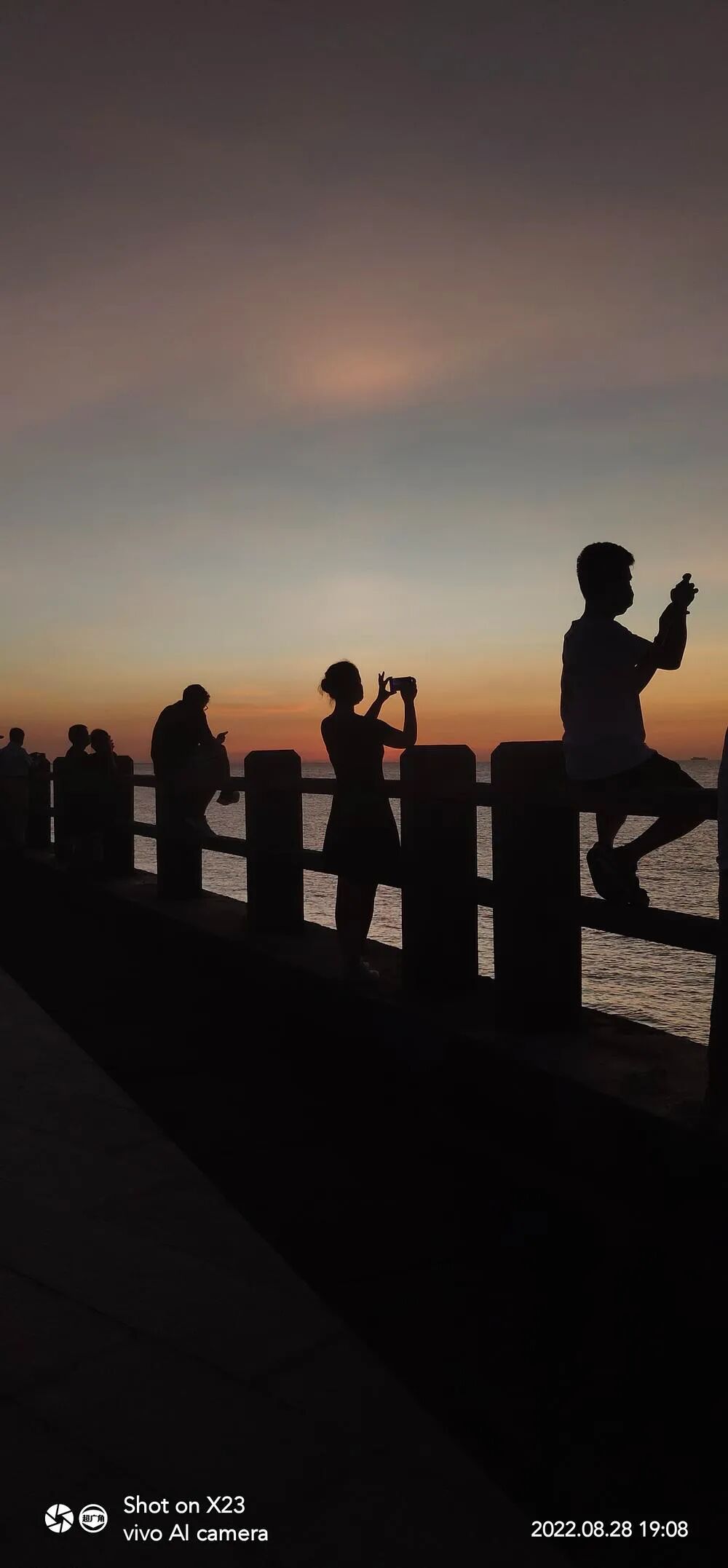 周日傍晚做完核酸后便直接来到了海边观落日赏晚霞,沿海堤岸人们或跨坐或倚靠着栏杆,望着大海尽头徐徐落日,姿态各异,中间这位女士是应一位摄影老者的要求摆拍,见此我赶紧举起手机抓拍了几张,于是镜头里每个人面对夕阳都呈现出不同的状态。