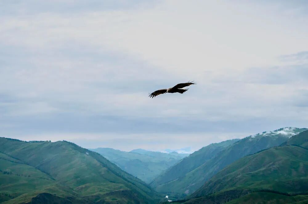 所以鹰是飞在天上的,构图来说,要考虑把鹰放在画面上半部分。这样做还有一个好处就是地面景物交代更为全面。尤其是对于这张照片来说,可以看到山谷,画面更加完整。