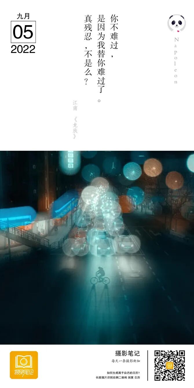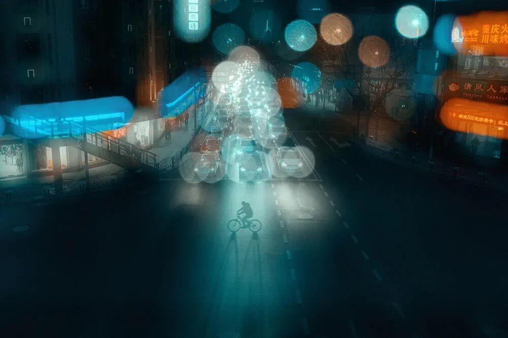 最妙的就是主体——自行车,位置非常好,而且因为车灯的缘故,拉出了很漂亮的影子。同时因为自己不发光,所以虚的那张也没有在任何地方留下痕迹。