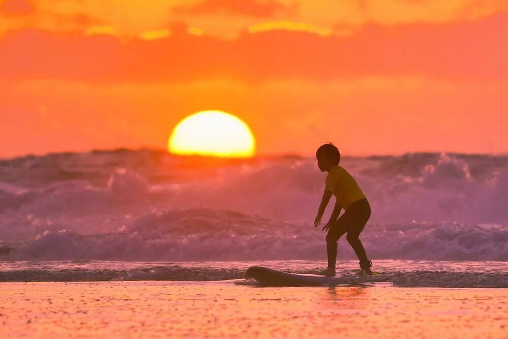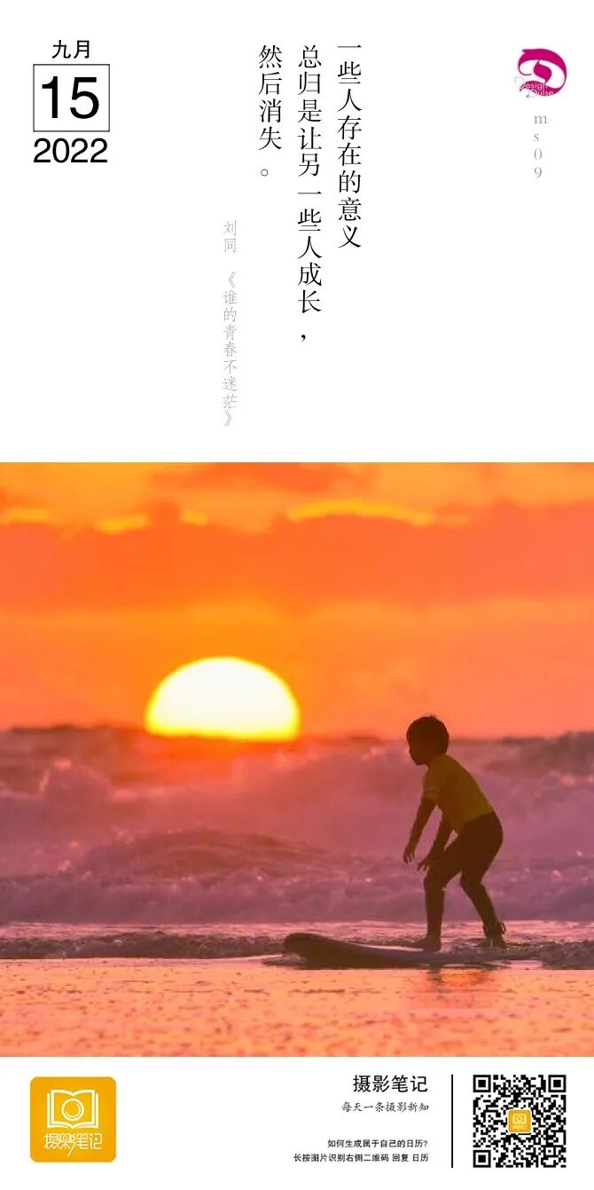 小朋友们玩嗨了,冲浪冲到太阳落下海平面。取景:低机位将人物与海平面,夕阳置于同等高度。等待小朋友接近夕阳按下快门拍摄人物剪影。后期:降低对比度,增加暖色调饱和度。略剪切。