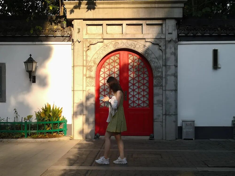 南京1912街区,在拍摄红色大门,等候人物出现。手机拍摄,后期降低曝光,调整暖色。请各位老师和同学多多指正!!谢谢!!!