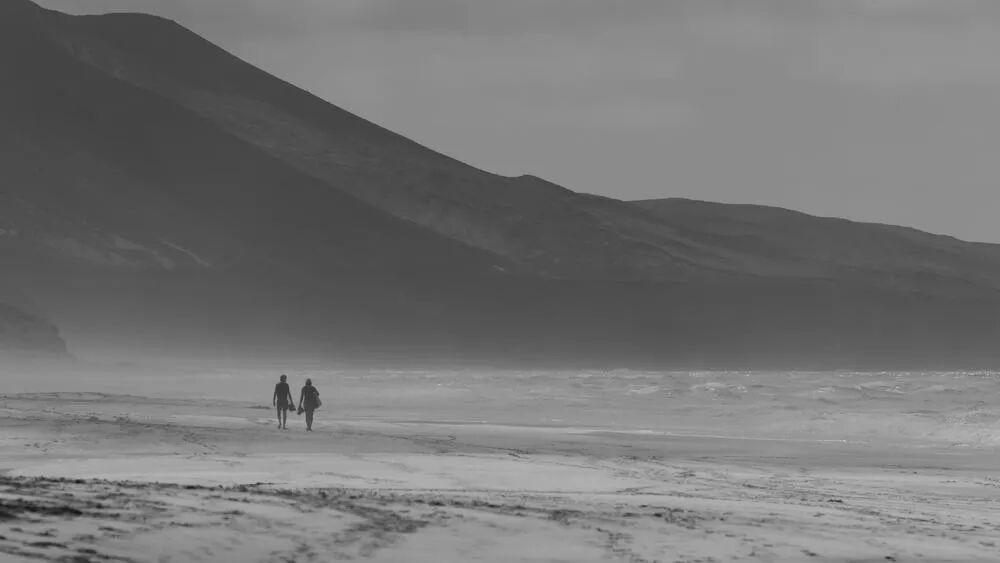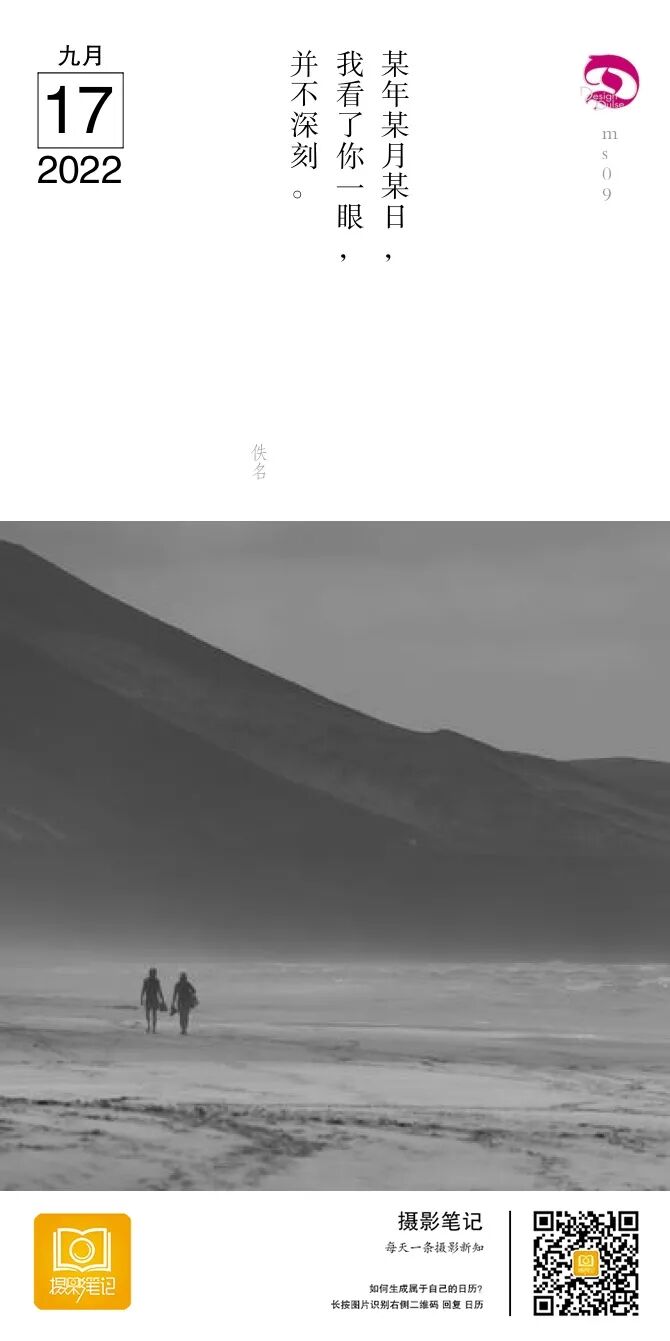 风急浪大的海滩上水气缭绕,逆光下有股冷峻的气息。取景:逆光取景,赶上两个游人走向远处,取其剪影活跃画面。后期:取黑白,略剪切。