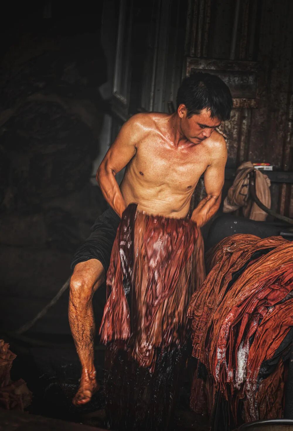 浆纱香云纱(响云纱)是南方丝绸的一种。顺德非物质文化遗产。由于制作工艺复杂,且是全手工制作,旧时只有少数的富人能穿得起!曾经几近失传。好在政府在申遗后保护下来。这是其中的一道工序:浆纱(染色)。浆纱后,要进行晒干,再浆再晒,如此反复几次,费人费时费力!每一次都是体力与汗水的结晶!照片:浆纱师傅在染池里拿出浆好的纱布料。染房前面有一堵墙,现在墙上往下拍摄。后期:后期有所剪裁(想表现师傅在染料池脚踩布料,前景有杂乱的染料桶,只好剪裁舍弃)前期为了暗部细节而向右曝光,后期恢复高光细节。由于背景杂乱,后期压暗了背景。突出人物的肌肉线条。