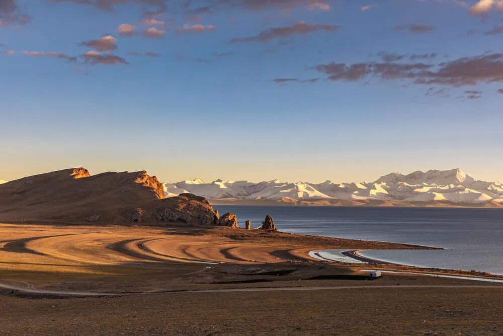 在圣象天门看到的念青唐古拉山脉,夕阳西下,粉红色的色彩令人着迷