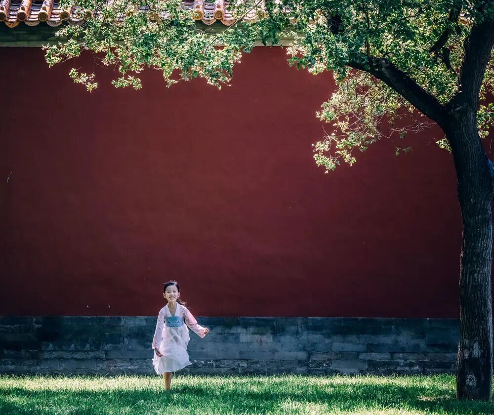 带孩子去完成暑假作业 烈日顶光 头发都打绺了没什么拍孩子的心思武英殿往北绿树红墙跟干净 开始没注意光的位置树梢 草坪都是亮的 就拍了个小黑人这张稍好一点