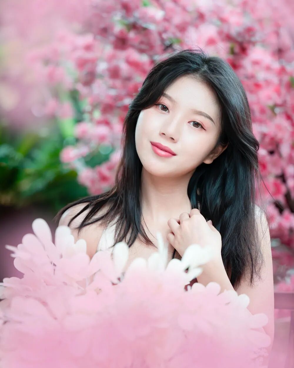 首先就是前景的花,看起来应该是两种叠加的,虚掉了的粉色的花还可以。但是那个没那么虚的那一层白花不是很好看,还挺碍事儿的。