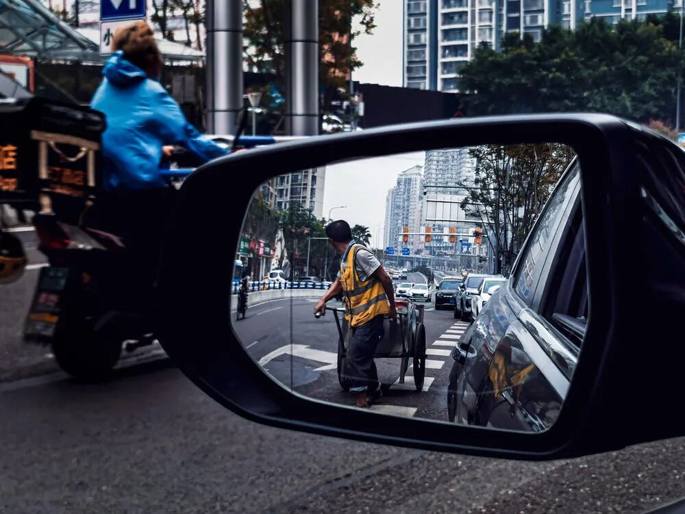 一张手机片,前几天把车停在路边等人的时候,从反光镜中看见一个工人拉了一车东西过来,就决定用手机拍一张,刚好一个骑手也从此地经过,本是相向而行的两人,把拉车的工人安排进了反光镜中就形成对向而行。无奈手机拍照反应太慢,反光镜的人物不是最好的姿态,当时已忘拍照按钮是可以直接连拍的。