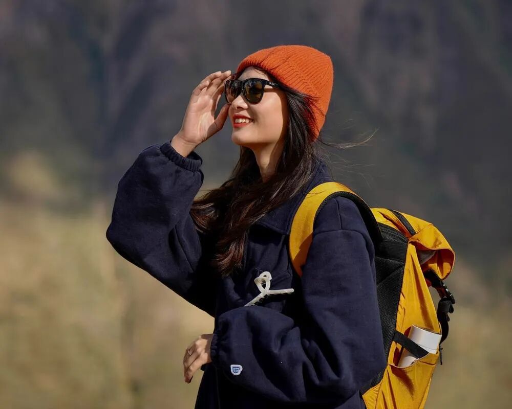 阳光明媚,美女也高兴!背景中淡黄色为山体是黃土虚化后形成的!