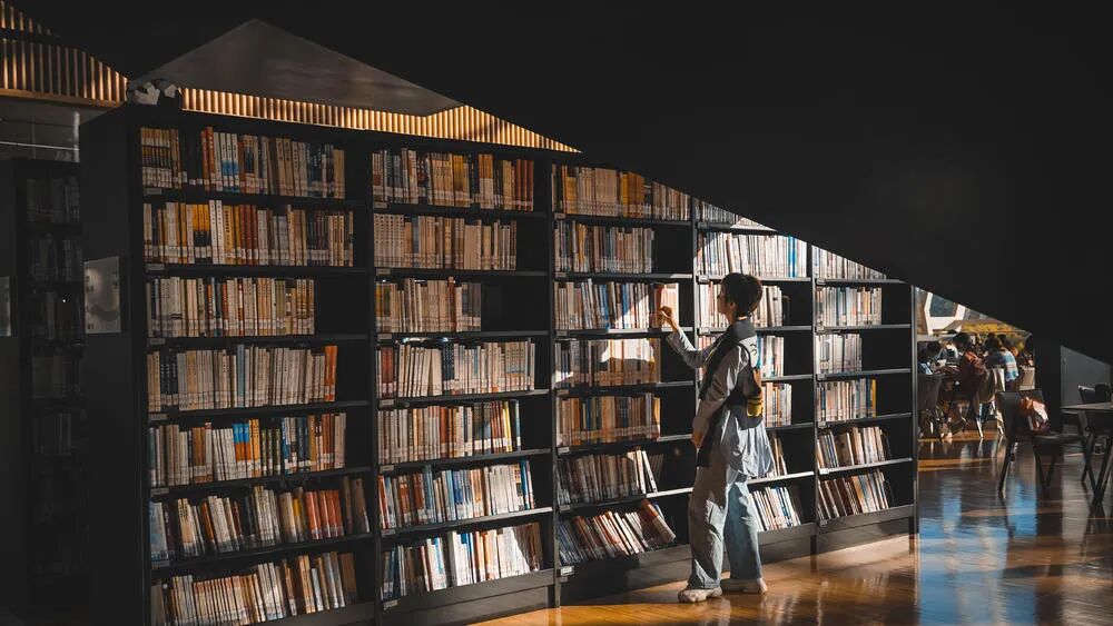 点评:图书馆很好看,这一部分很干净,除了远处不显眼的地方有人,这边很空。然后你的朋友过去,自然就是点睛之笔了。