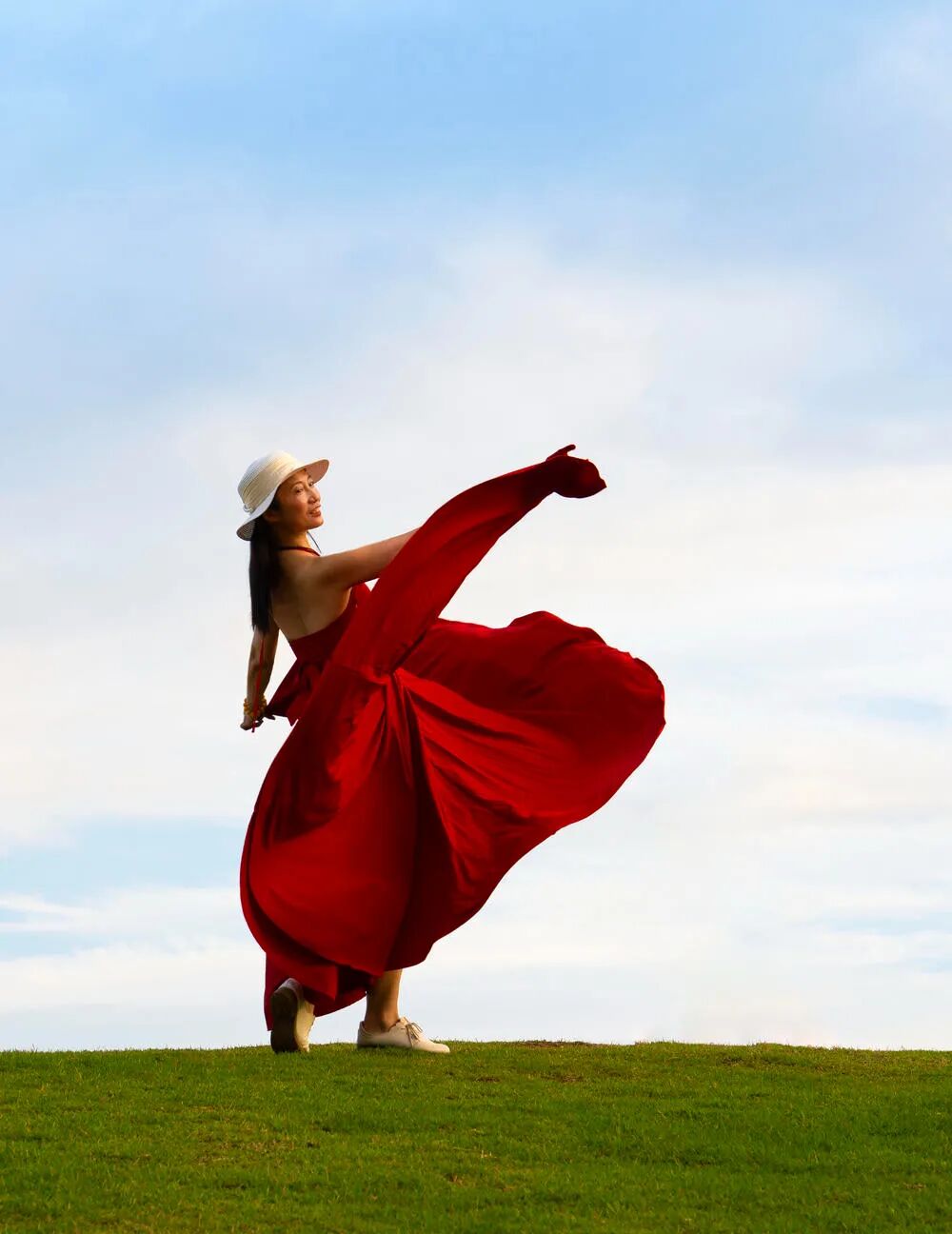 光线方面也没问题。光线柔和,我们看裙子上的光线,非常漂亮。所以如果是我,在拍摄大场景的同时,也会长焦打几张裙子和身体局部的特写。表现这个裙子飞扬的光影。