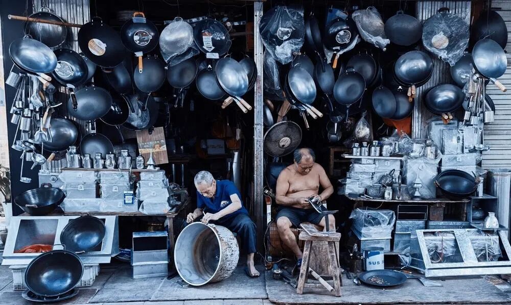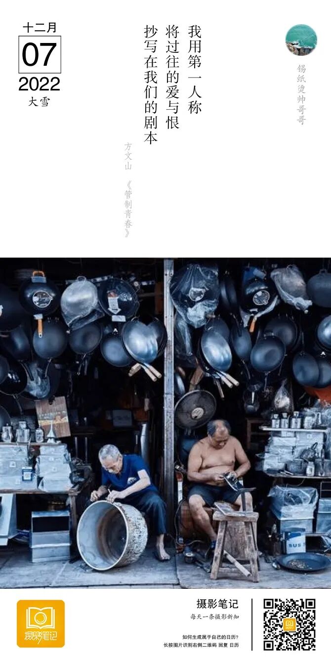 点评:有意思,左边做大锅,右边做小盖。中间建筑有条线,一下子把照片分成两份。两边的人稍微有点背对着对方。画面虽然元素很多,但是不乱,都表示这个是一个卖锅的地方。