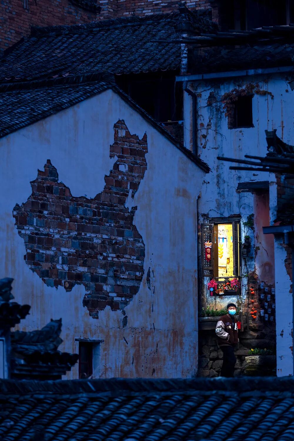 12月11日,江西篁岭。日落时分,远远看到这面地图墙,旁边小店亮起了桔黄的光,等了好久只等到这个人。后期用颜色查找调整图层压暗环境,蒙版擦亮光照部分。谢谢大家一直支持、点评。