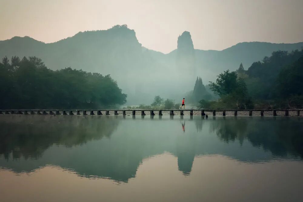 这样就等人,等这个穿红衣服跑步的人。来了就拍。人物随着石桥下压而下压,左右居中。一个典型的大场景小人物。