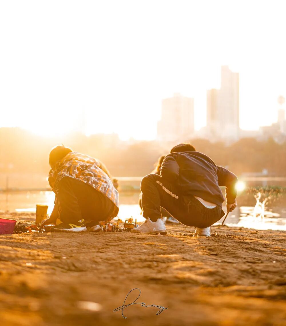 打卡作业2022年最后一次打卡照片 依旧在浅滩上拍摄 当我站着看见有两个小朋友在玩耍 再抬头一看后面有着很好的光线 于是马上蹲下来 低角度拍摄 后期调整了光感阴影 但无奈天空太白了 只能做一下模糊处理 这或许也是缺点所在 希望得到老师和同学们的点评