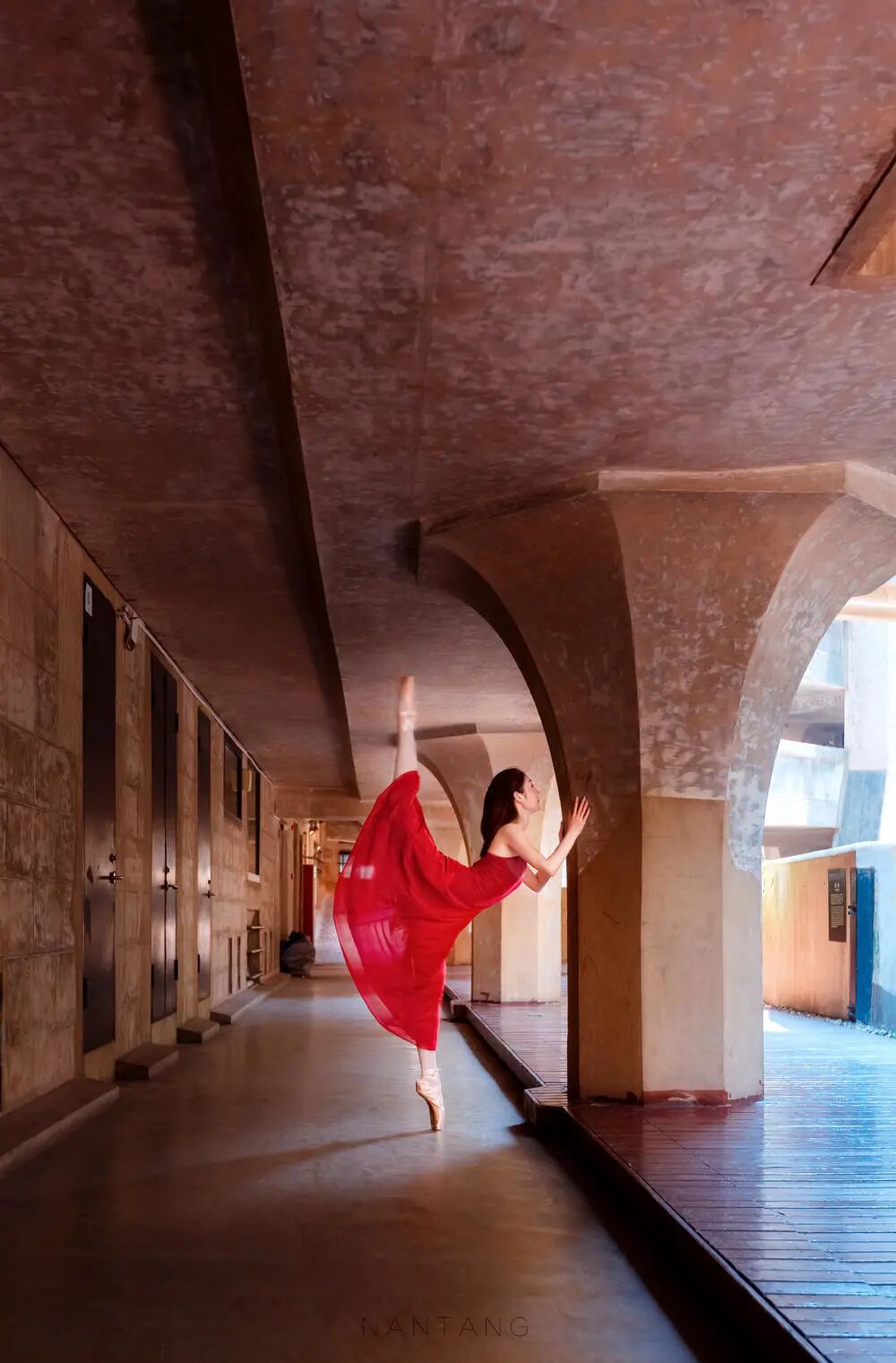 给学芭蕾的小姐姐拍摄一组照片,为了体现她舞姿优美,找了比较刚性有棱角的1933老场坊场地。走道比较暗让小姐姐靠近外廊一侧,使得屋顶透过的阳光可以打亮主体,使用广角拍摄交代空间和环境,也让小姐姐的舞姿有些冲击力。因为光比大,减曝光拍摄防止高光过曝。后期提亮暗部、调色。