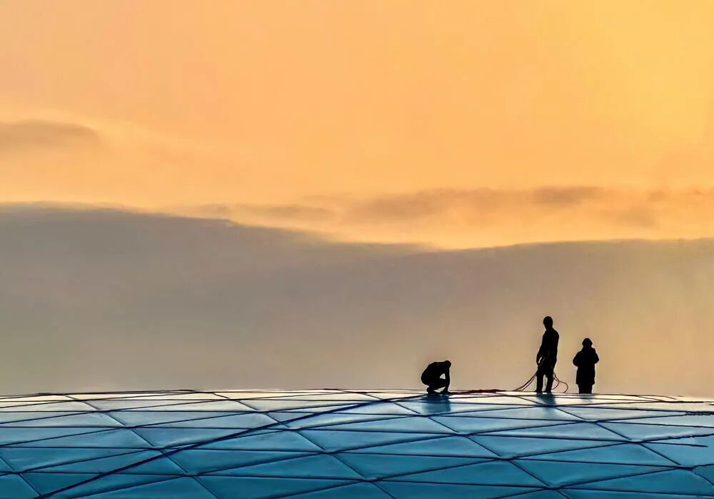 夕阳下的体育馆屋顶辛苦打扫卫生的工人!手机片!该体育馆屋顶本就由蓝玻璃构成!敬请各位同学指导!谢谢!