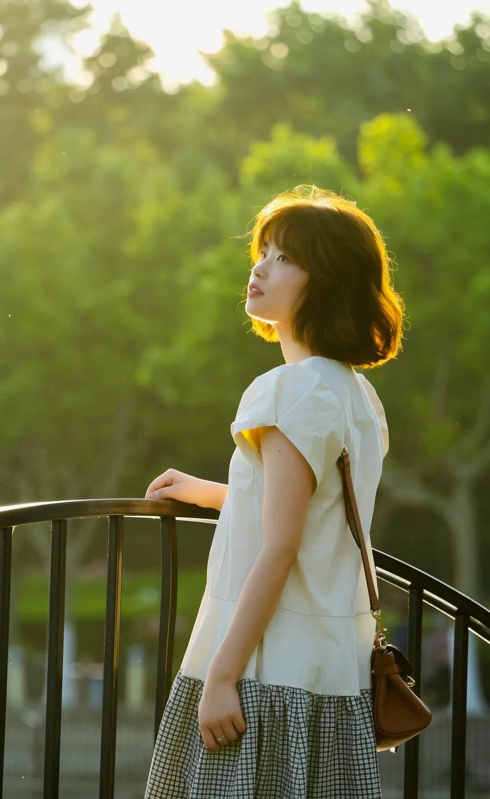 取景:世纪公园,下午,光线很柔。逆光照在头发上很漂亮。让模特去找光。在湖边的这个栏杆上。我离得稍远,用长焦拍摄。曝光:逆光 后期适当调亮人脸,好像还是不够。虚实:用长焦的虚化。构图:这张裁剪过,人物大概位于右侧三分线。