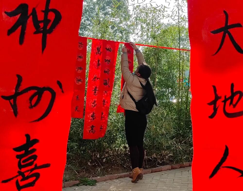 从缝隙中看到一个人在挂春联。