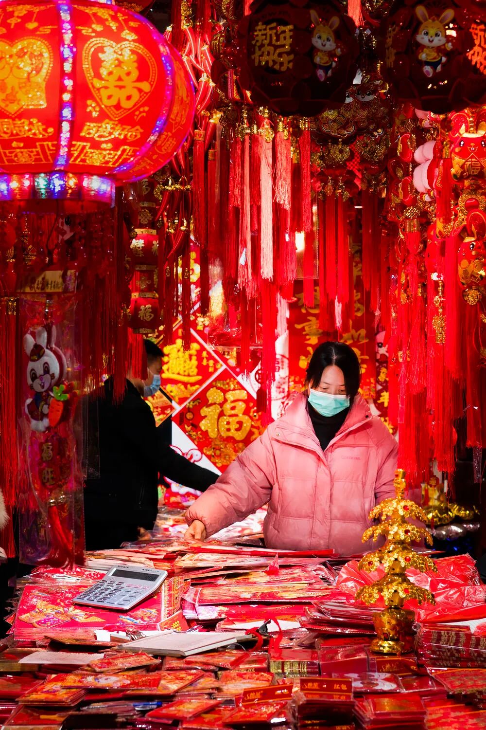过年了正在挑选年画的顾客,计算器正在一旁静静等候……