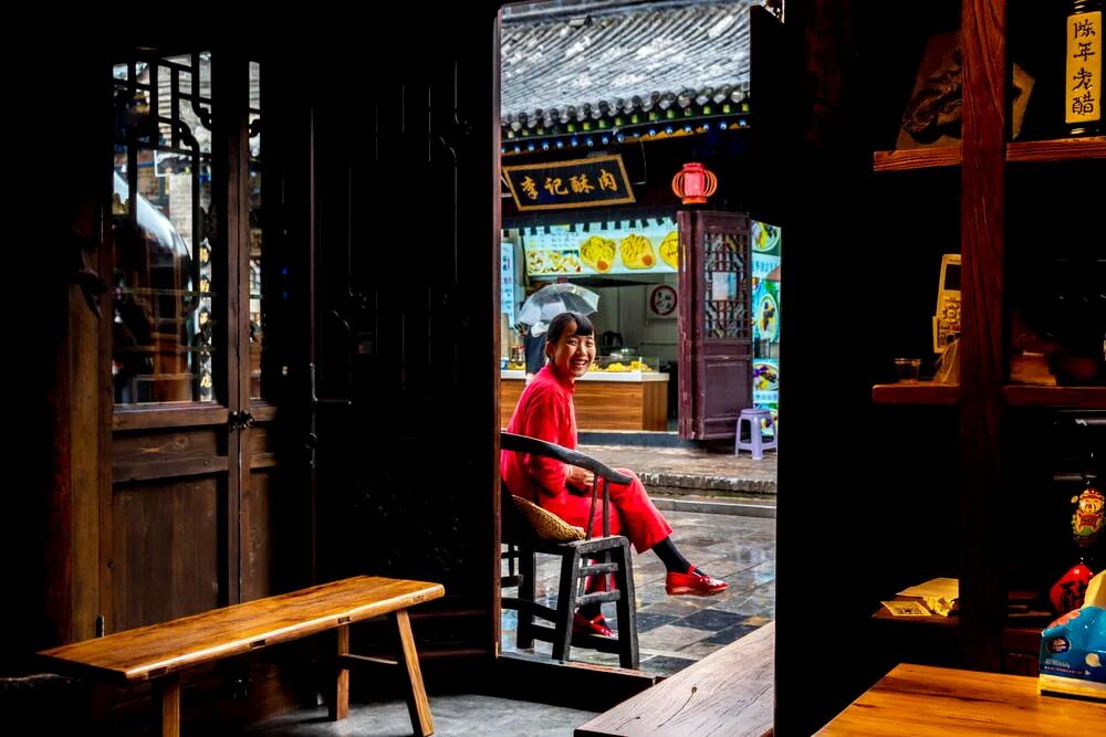 点评:控制一下取景范围。缩小一点,这样人物表情就明显一些。还是很喜庆的。同时维达纸巾的一抹蓝色就也没了。拍摄时还要注意人身后的行人。如果是从门右边有个行走的匆匆的行人,慢门稍微虚一点,还是很有味道的。至少别在姑娘脑袋后面来个人,还打把伞。这是竖了个蘑菇吗?