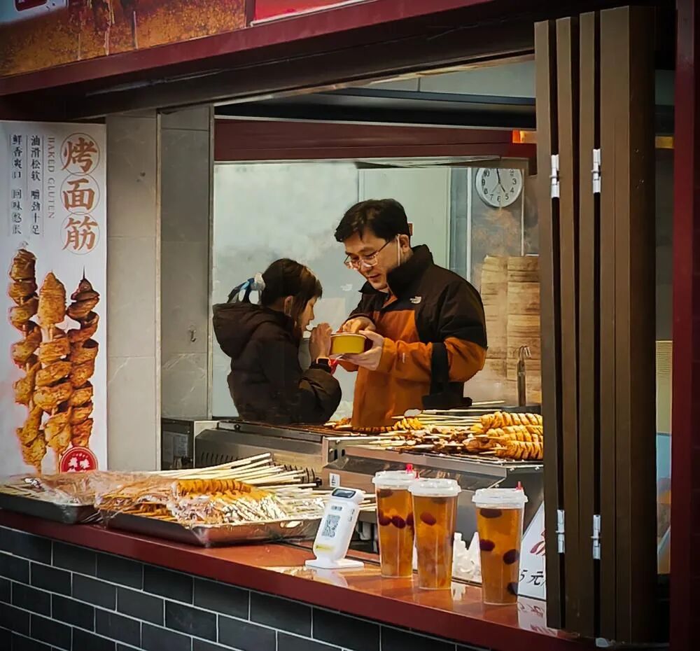 温馨一幕在小吃街的一个店铺里看到一对父女(还是情侣?)在吃东西,画面很温馨。男士的衣服和环境色彩也很搭,于是用手机拍了下来。请兔子老师批评指正,谢谢!