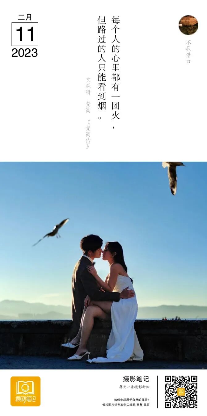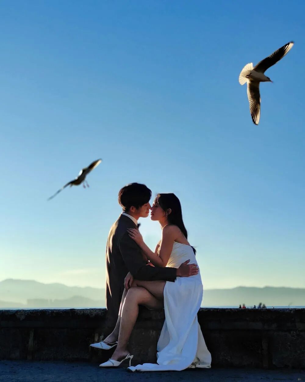 点评:首先是人物状态,我觉得俩人状态非常好。说明对面的摄影师还是很对引导的。拍摄时间来说,这个逆光后期好了也应该很好看。再说周围环境,天上的海鸥确实非常增加氛围感。