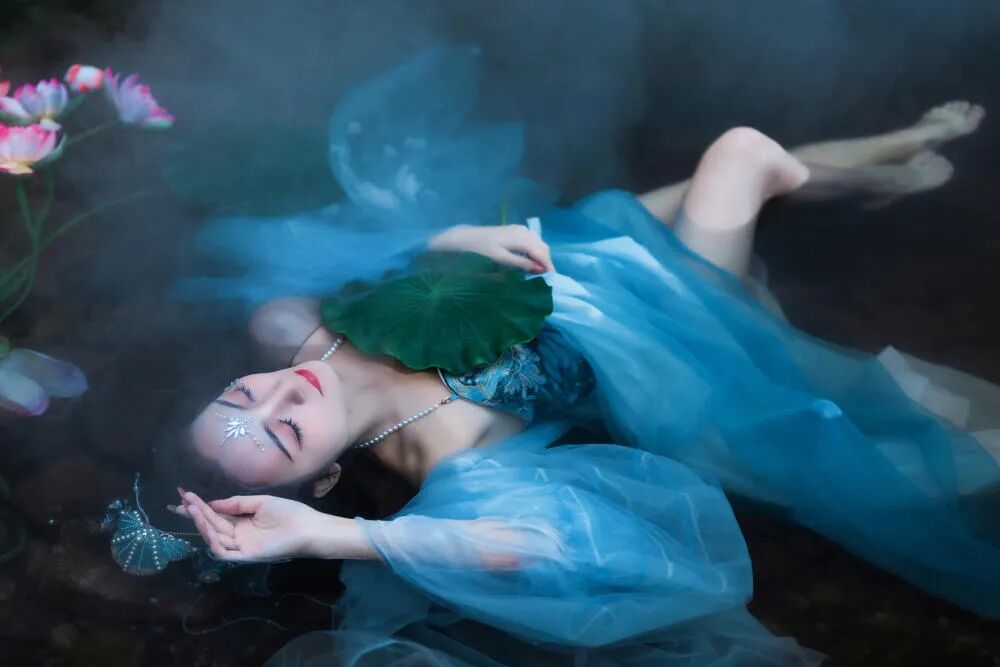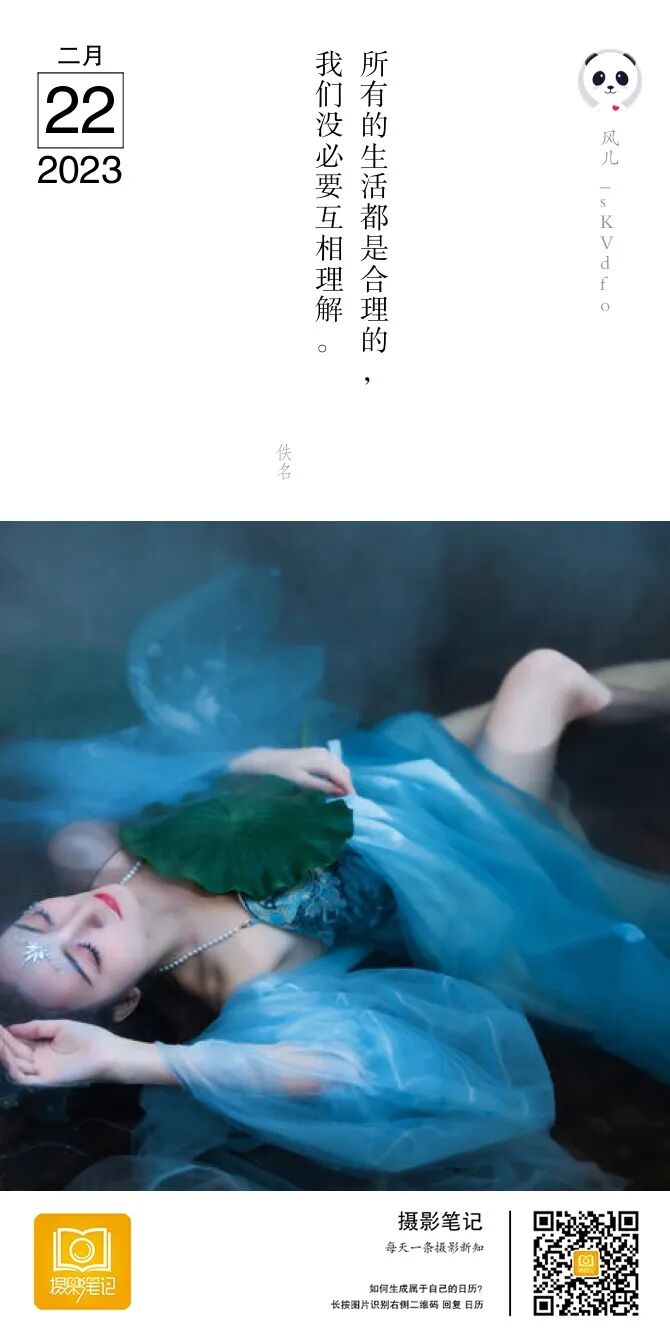 那几朵荷花我觉得比较俗气,其实水里那两片花瓣就够了。然后姑娘的妆容上也比较红艳,感觉和画面中整体蓝色的氛围比较冲撞。人物是很静的状态,靠色一些比较和谐。(我跟你说,这些我都写在《新摄影笔记》里面了。)