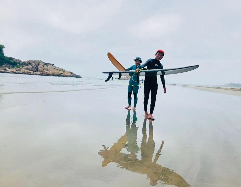 走在海边的沙滩上,看见一群冲浪的勇士,等了下,利用沙滩海面的倒影,拍下了两个拿着浪板上岸贼酷的瞬间,