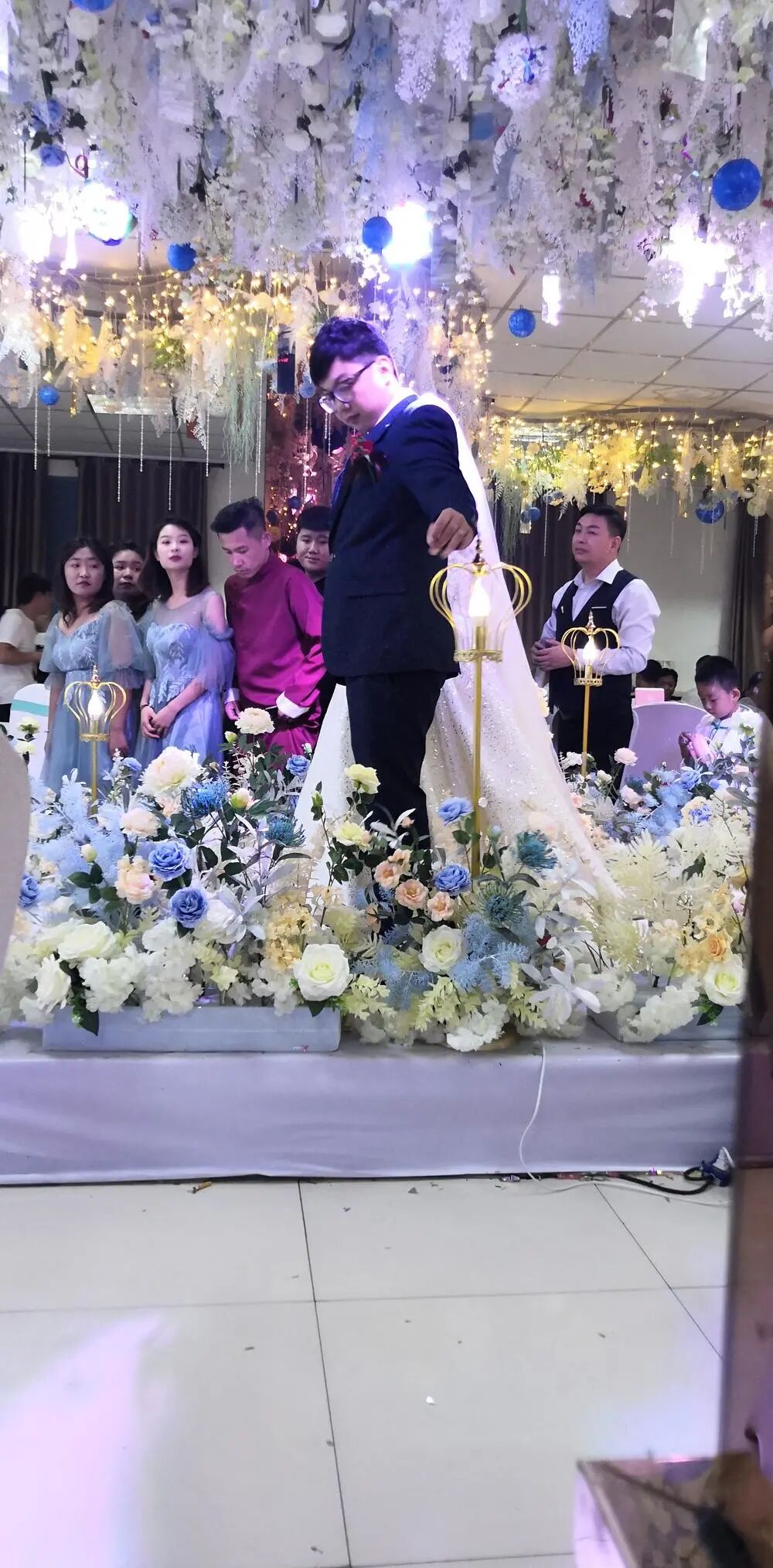新郎的表情似乎还挺纠结的。灯光打在身上略显诡异。