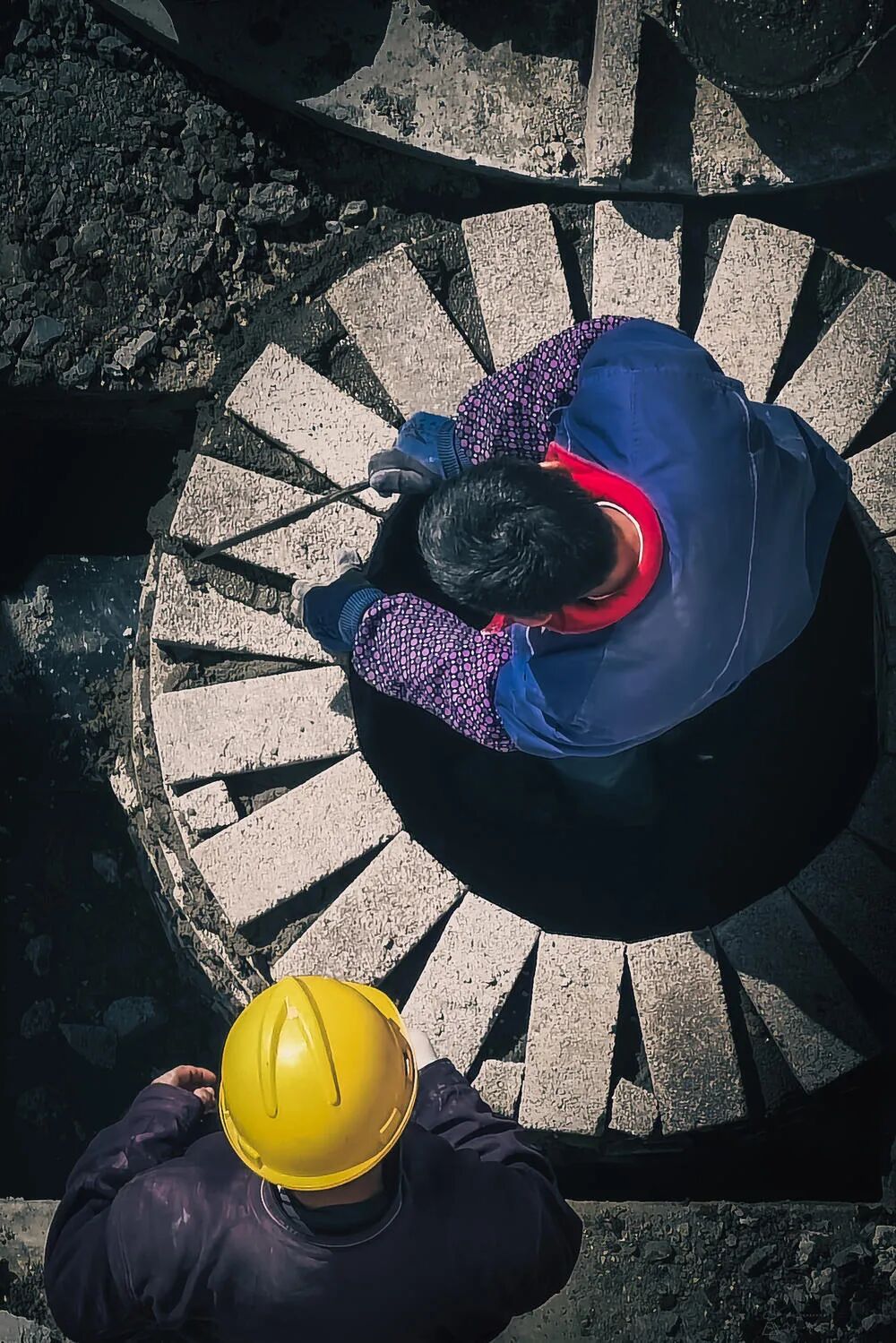 这张照片最重要的就是工地上人物的工作。那么画面中的主体人物应该是这个在圆圈中的人,在做着什么。但是从构图来说,你把他放在画面中间就最好。但是现在看来太靠边了。