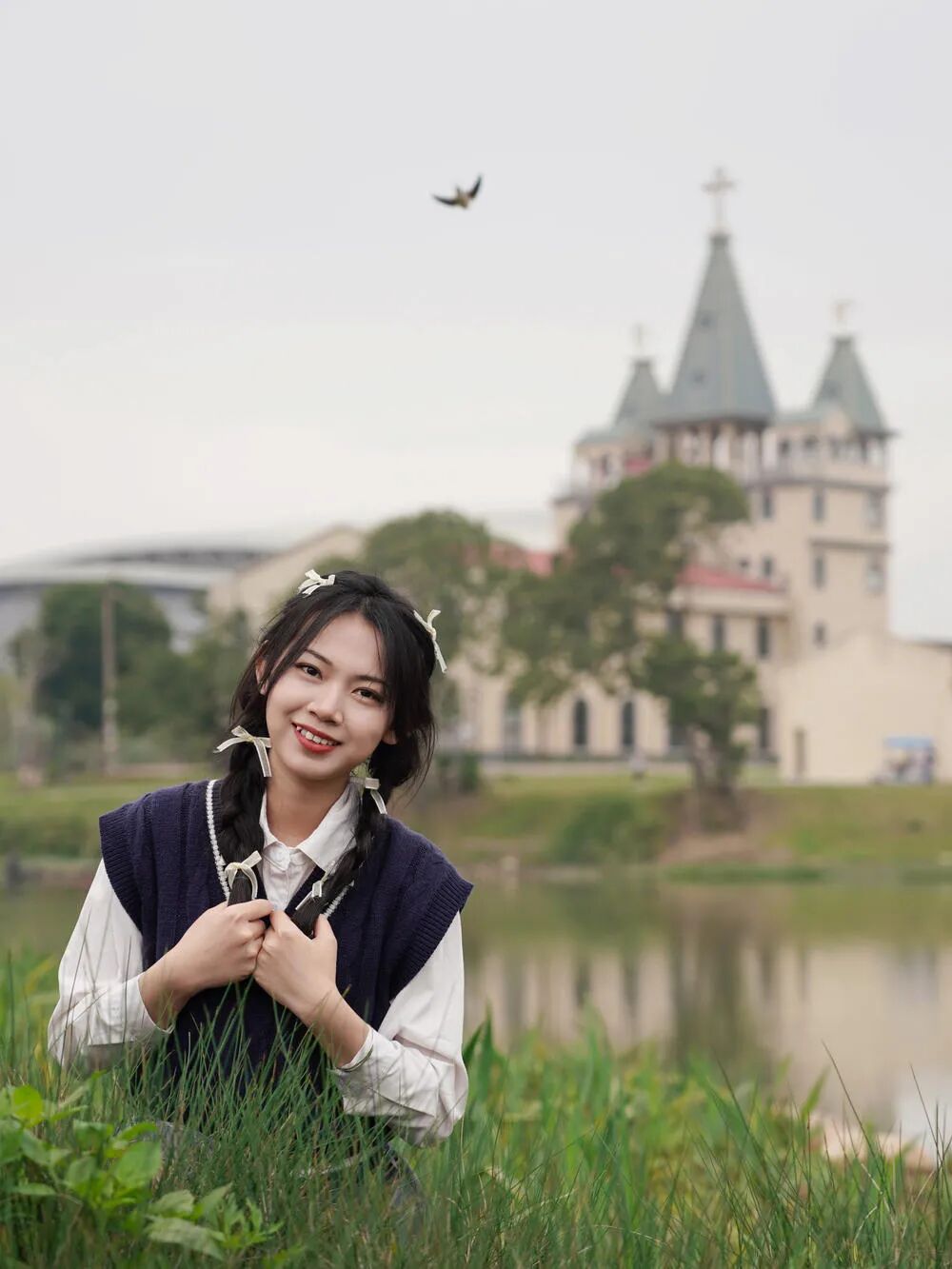 现在姑娘和背后的建筑,都是主要元素。两者在照片中应该呼应。那么构图到时候你就要考虑这种呼应。