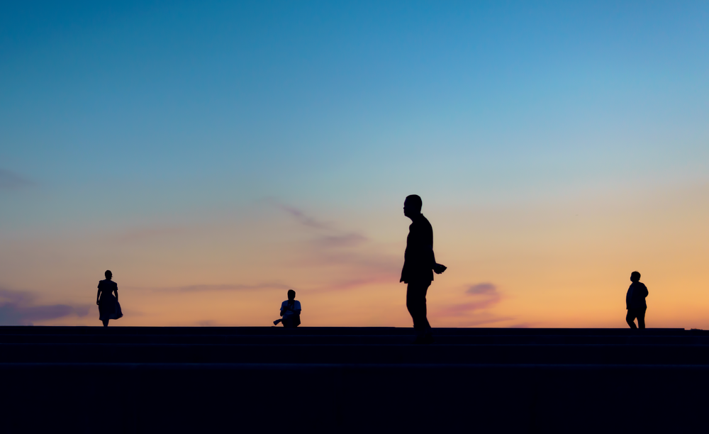 首先就是画面非常干净。所以几个人物异常突出。然后几个人是剪影形式出现在画面中,就是说完全没有表情细节,只能从姿态来看。而几个人的姿态无疑是很棒的。各有各的样子,但是整体每个人都符合这个日暮时刻的感觉。