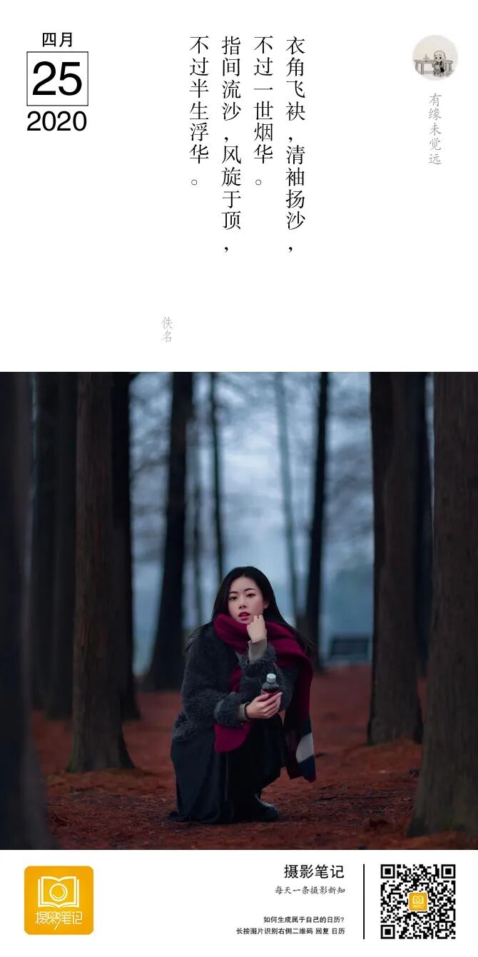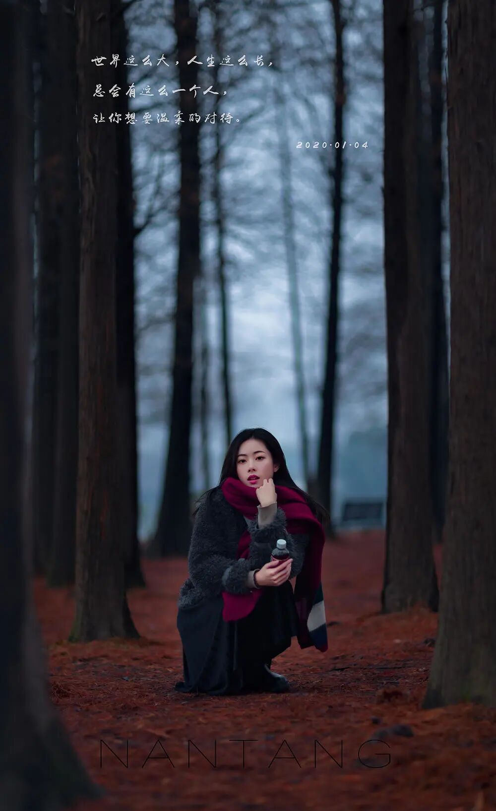 公园里一片杉树林,松软的杉树叶厚厚的铺满了一地,天气阴阴的显得非常宁静。让小姐姐走进树林里,利用树木做前后景,形成纵深感。环境比较暗,压低曝光不让天空和小姐姐的脸部过曝。后期进行调色,增强了冷暖对比烘托氛围。