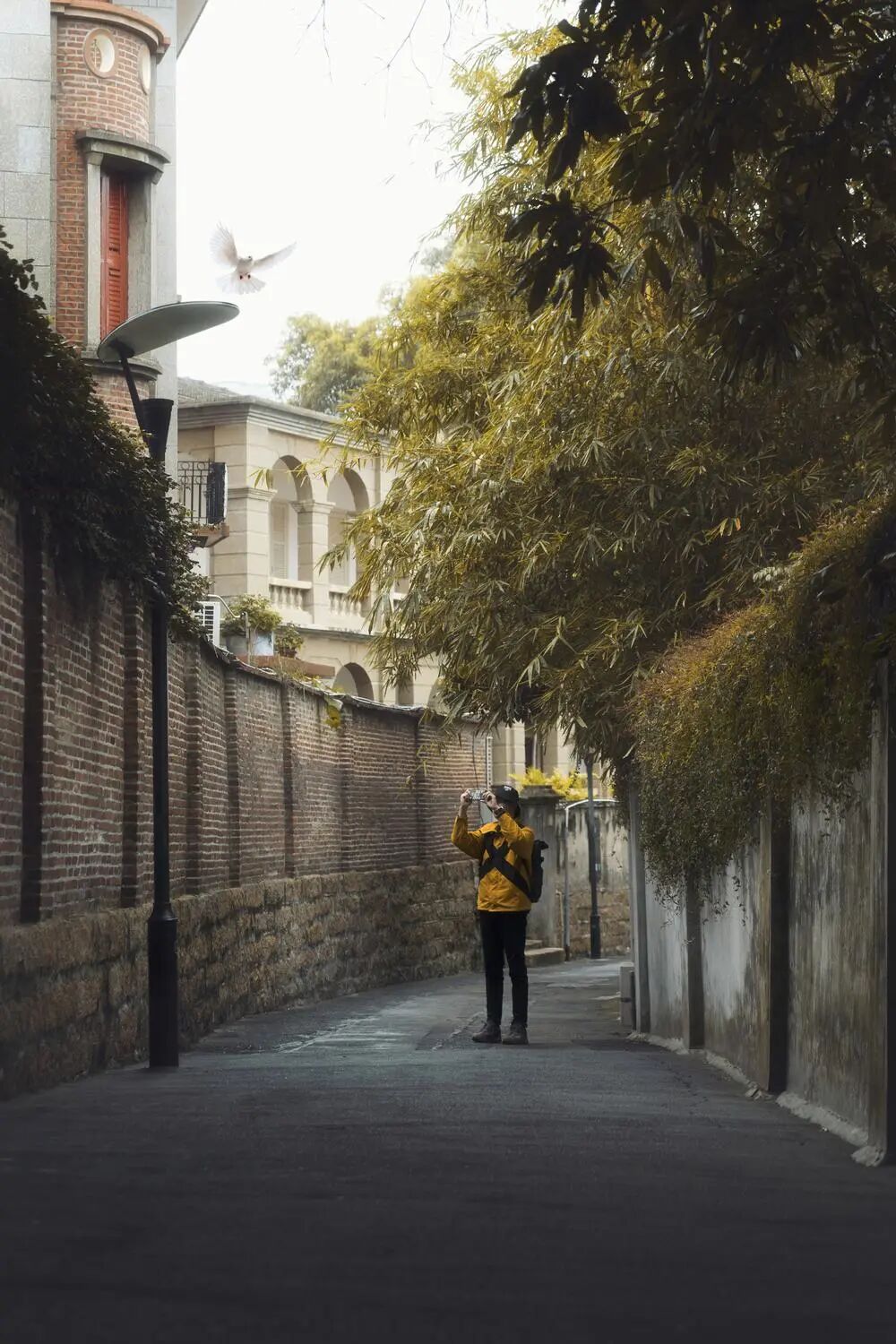 点评:一个人在小巷子里拍摄一只落在路灯上的鸽子。挺有意思的一个场景。不过我觉得最壕的还是这个小巷子的很幽静的感觉。一切都显得那么美好。