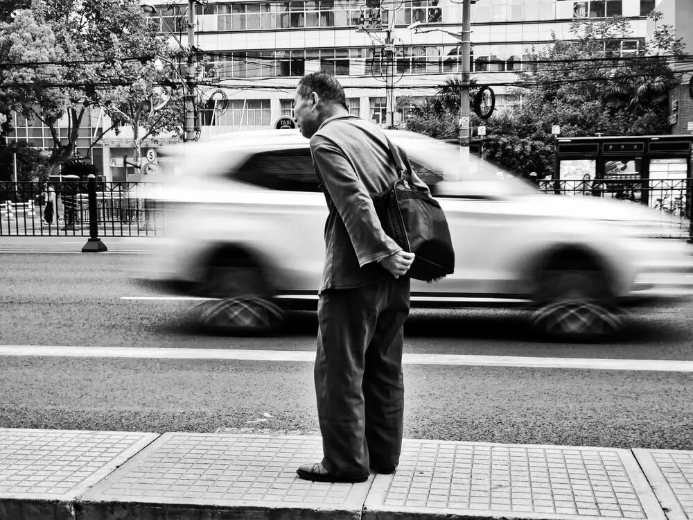 在车站等车的时候,无意间看到这个老人用手托了一下身上的包,想必那个包还挺重的吧,就有了拍下来的意思。拍的时候余光看到车子经过,想着凭运气把车子的样子抓下来,运气不错抓到了。疾驰的车与不堪重负的老人可以做一个对比。取景:负重老人的状态。构图:老人作为主体居中,现在看放右边一些也可以,人前留空。曝光:正常曝光。虚实:老人作为主体清晰,高速运动的汽车虚化。