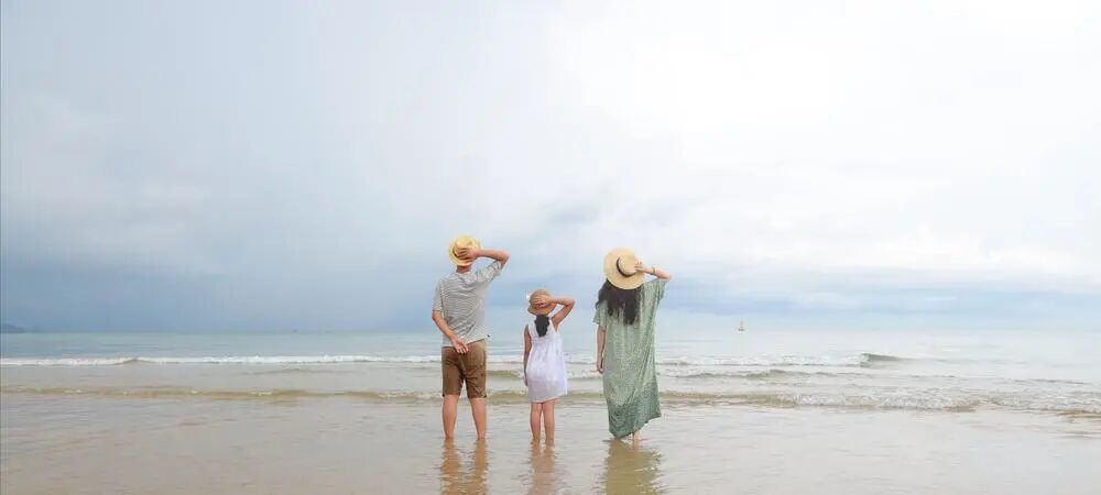 求点评!今年暑假去三亚旅游时拍的全家福!后期简单裁切了一下,三分法和居中构图!当天刚刚下过雨,没有太阳,海不蓝。