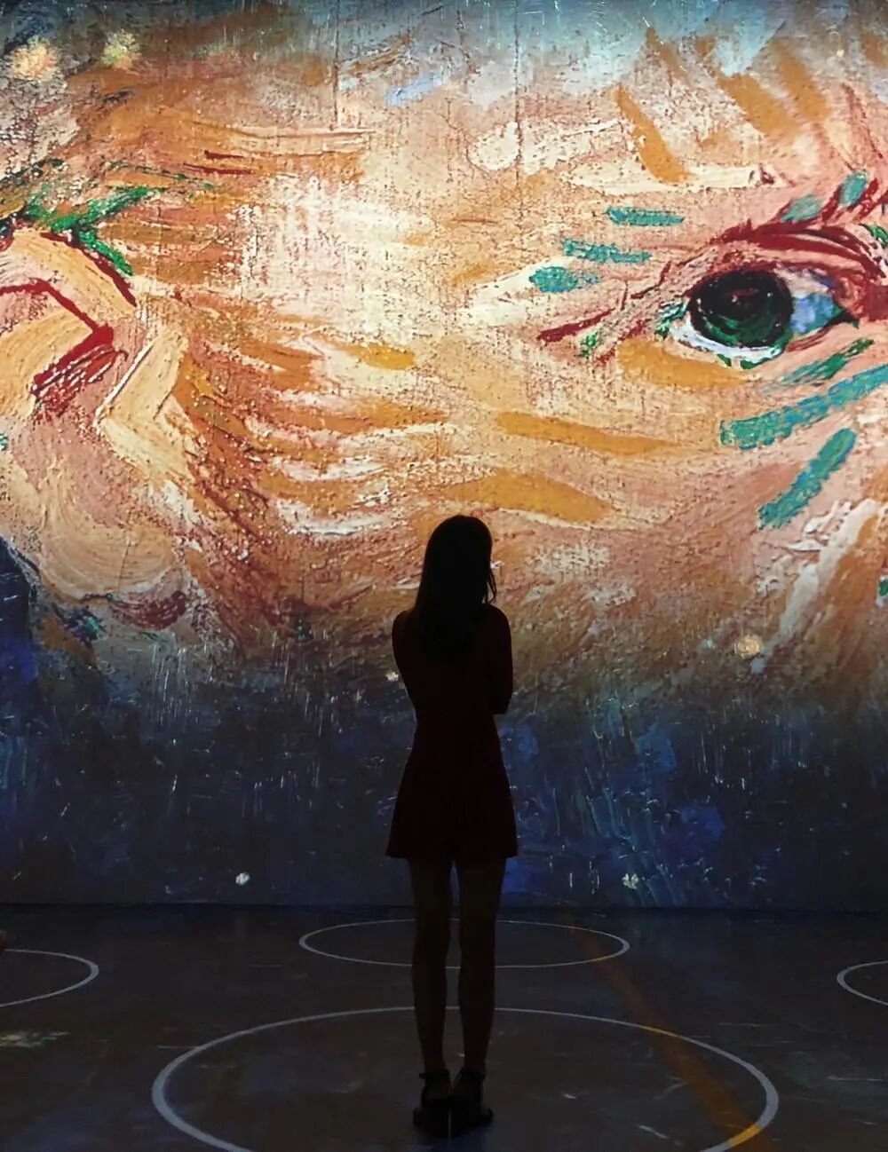 和女朋友一起看梵高作品展,在360度墙壁上投影,将女朋友的背影和画展同时记录下来(手机摄影)
