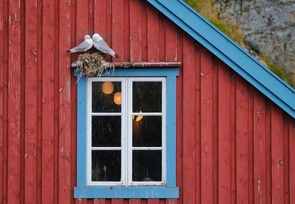 挪威佛罗敦群岛,具有当地特色的红房子,海鸥在窗上筑巢,两只海鸥相互依偎。