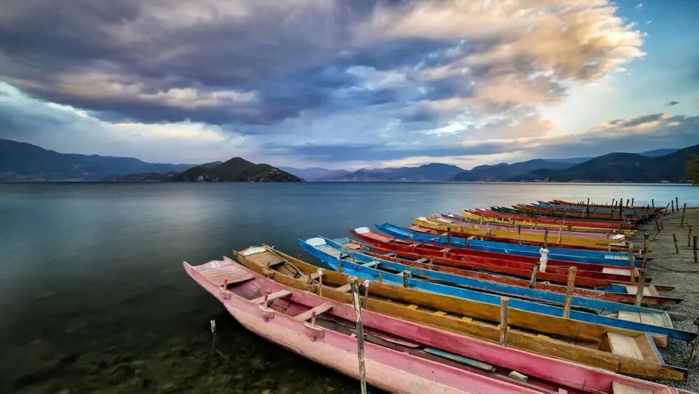 去年春天拍摄于泸沽湖大落水村的码头。傍晚,很多猪槽船都回到码头休息,船的颜色很丰富。拍摄时用了减光镜以达到降低快门加长曝光时间使湖面看起来光洁如镜,同时又用灰渐变压低了天光,保留了天空云彩的细节。后期调整了锐度和饱和度,加深了船体色彩的表现。