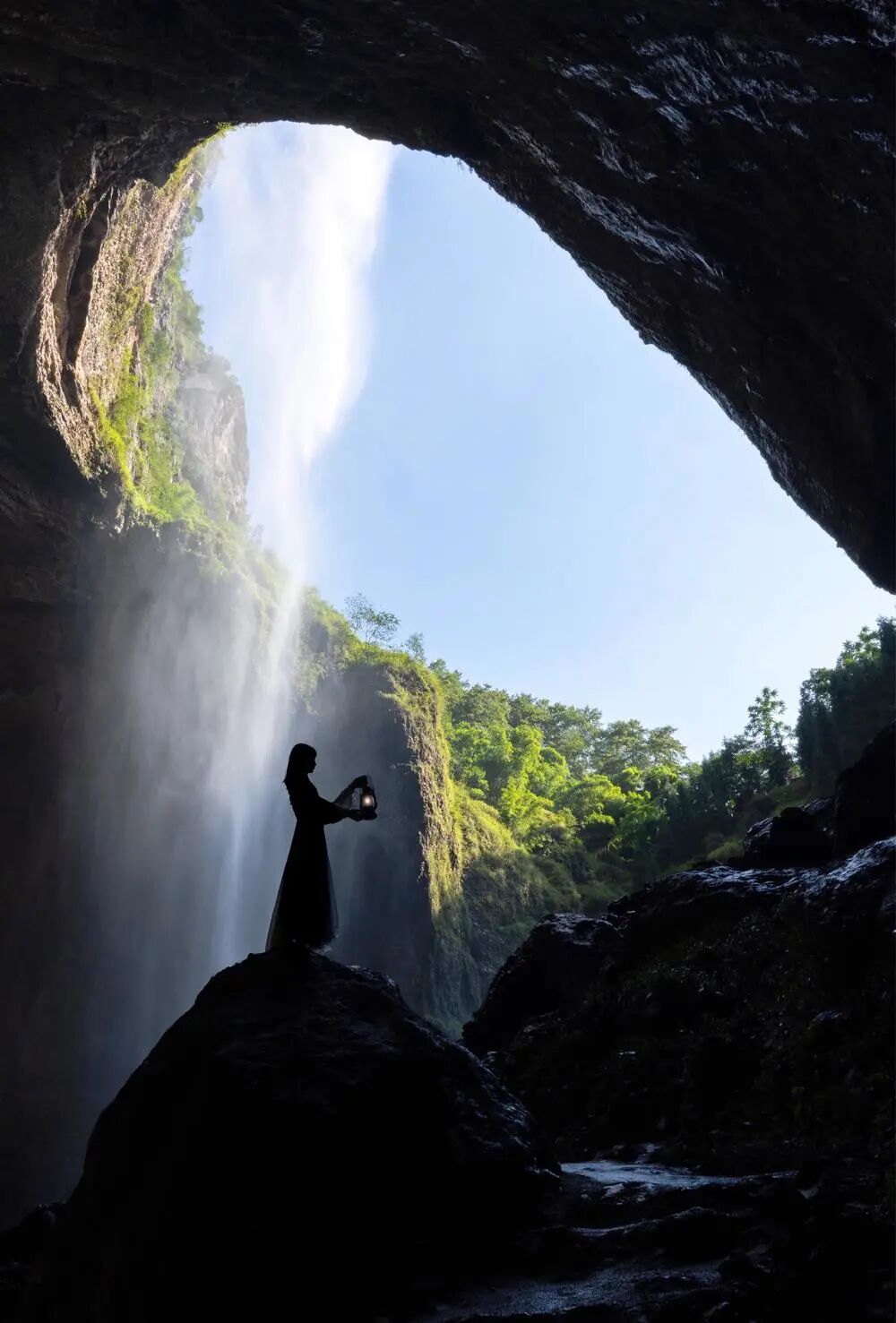 如果是晚上拍摄,为了表现姑娘的轮廓,估计她脚下会再放个很暗的灯。然后也会用很暗的灯,把瀑布补补光。