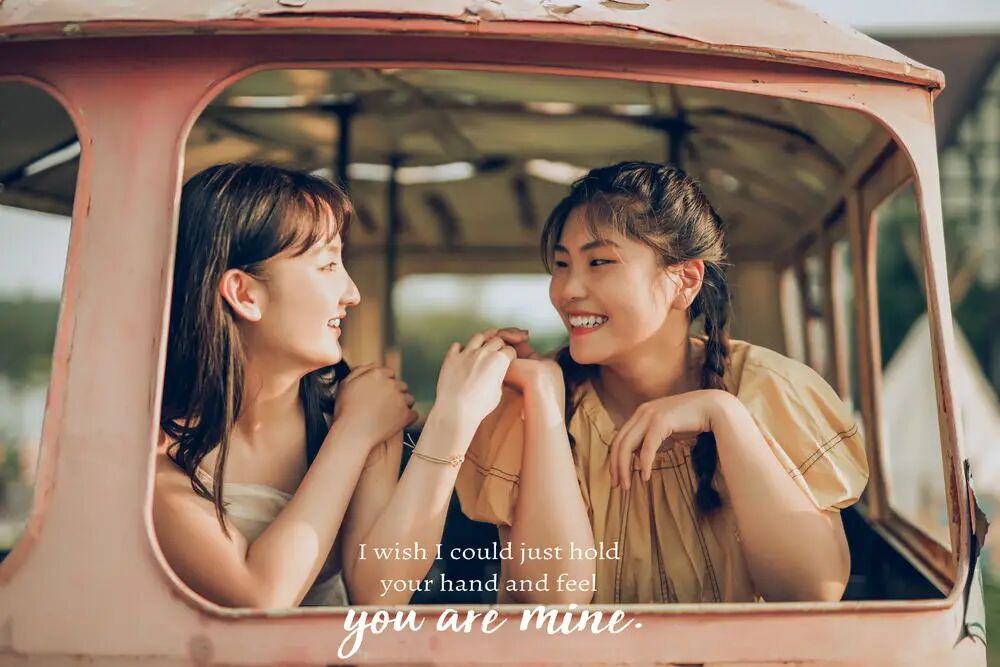 点评:我很喜欢这张闺蜜的合影,两个人的表情,尤其是右边小姐姐的表情,非常生动。俩人牵手的手的动作稍微有点别扭,但是好在表情够明显,而且表现好,吸引眼球。淡化了手上的动作别扭。