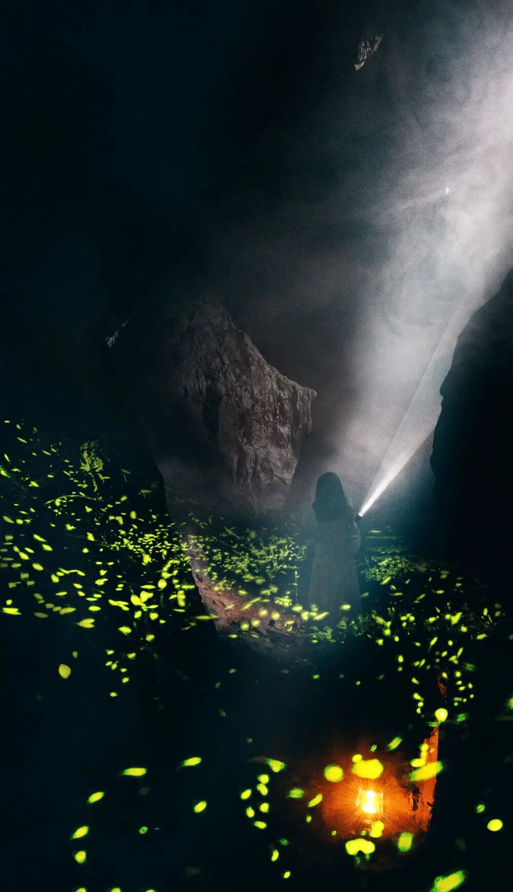 姐妹打卡、拍摄时间在下午4点左右、到瀑布下面的洞穴通道、远点有缝隙光线、瀑布较高飞溅成水雾、利用了马灯作为画面下部前景、人手持电筒作为中景、萤火总从中间的光比小到眼前黑暗光比大、亮度高、快门大概2S左右、感光度在8000左右、作品名(寻匿)或者请大家帮忙想想?、希望校长点评。